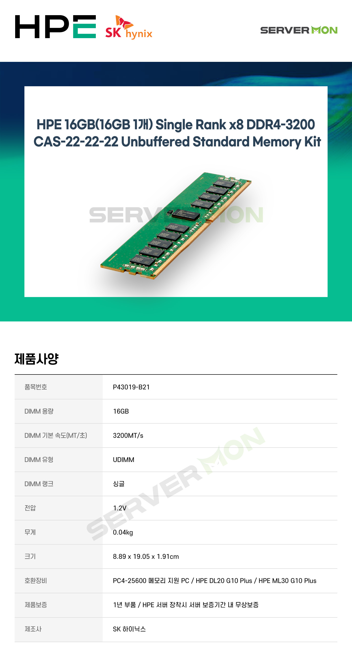 > HPE정품(SK하이닉스) 16GB 메모리 DDR4-3200 (PC4-25600) P43019-B21