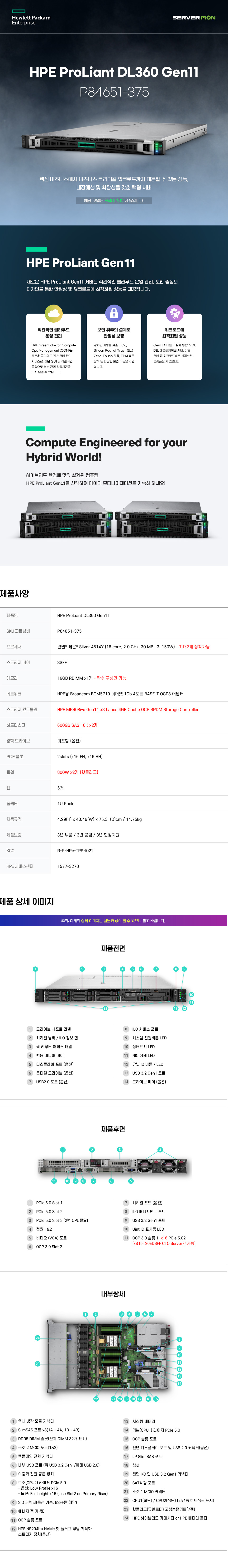 - HOME > HPE 서버/스토리지 > 랙형 서버 > Gen11 > HPE DL360 Gen11 (4514Y 16C 2.0GHz 1P / 16GB / 8SFF / MR408i-o / 600GB SAS *2 / 800W *2) P84651-375