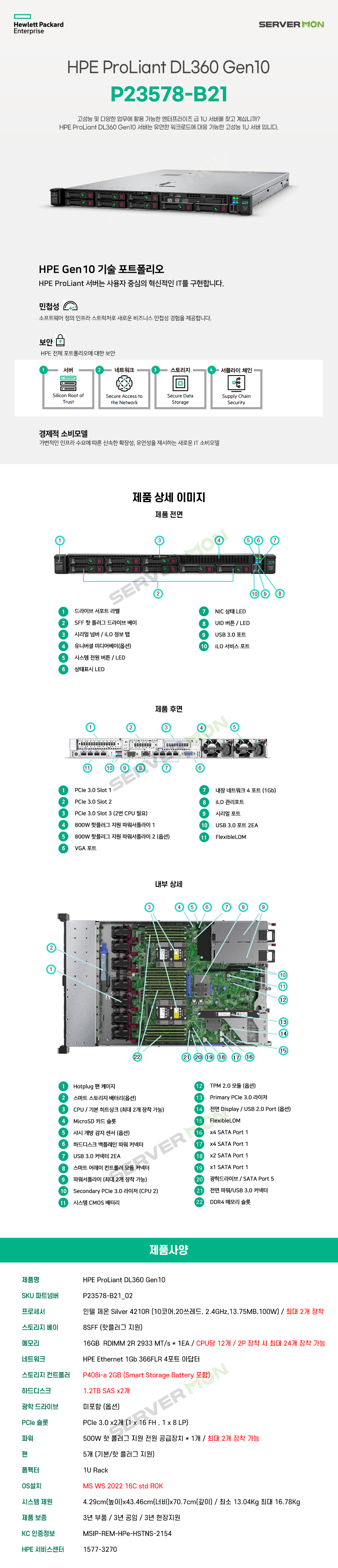 HPE DL360 Gen10 8SFF Svr (4210R 10C 2.4Ghz 1P / 16GB / 1.2TB SAS *2 / P408i-a 2GB / 500W / Win22) P23578-B21_02