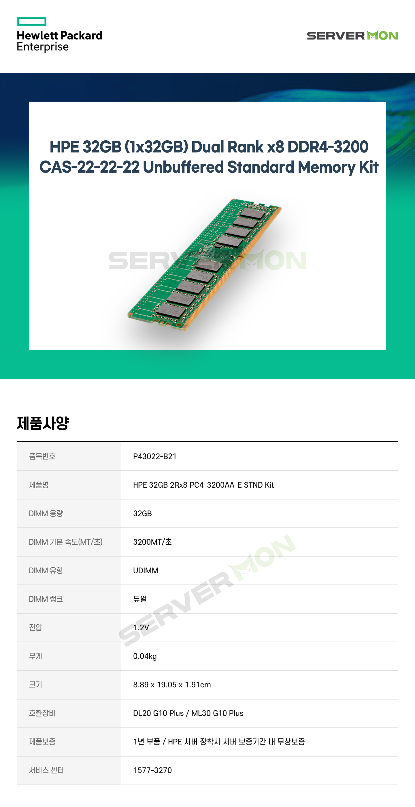 - HOME > HPE 서버/스토리지 > HPE 서버 옵션 > MEMORY > HP 서버 옵션 메모리 32GB (2Rx8 PC4-3200AA-E STND) GEN10PLUS용 P43022-B21 정품