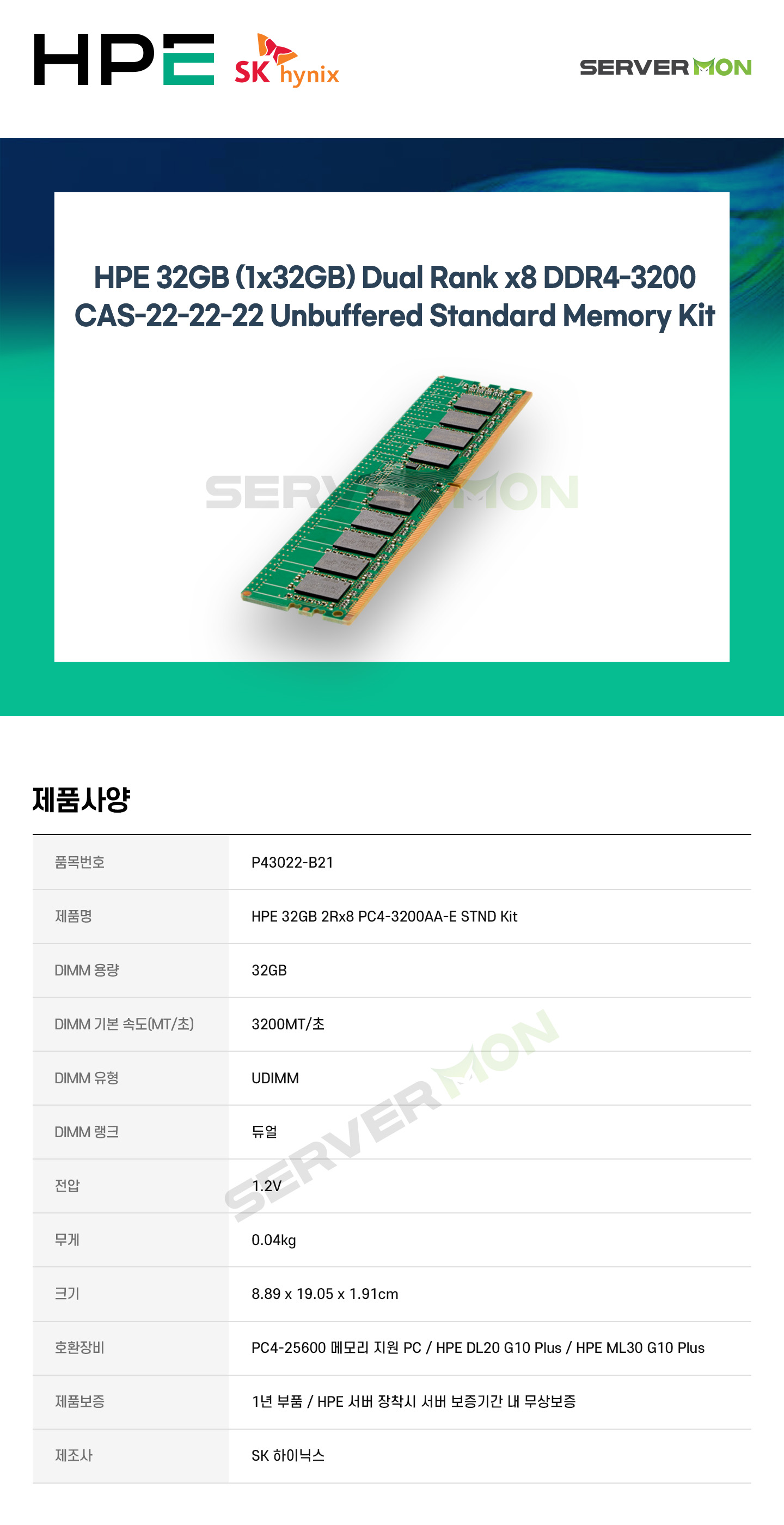 - HOME > 정품 서버 옵션 > HPE 서버 옵션 > MEMORY > HPE정품(SK하이닉스) 32GB 메모리 DDR4-3200 (PC4-25600) P43022-B21