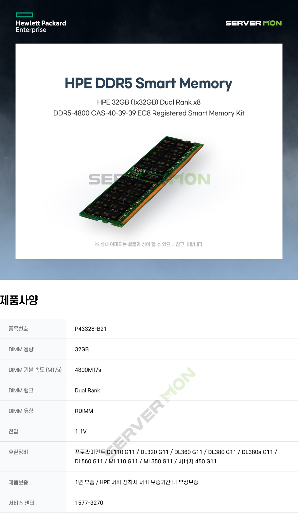 > P43328-B21 HPE 32GB (1x32GB) Dual Rank x8 DDR5-4800 CAS-40-39-39 EC8 Registered Smart Memory Kit 정품 신제품 새박스