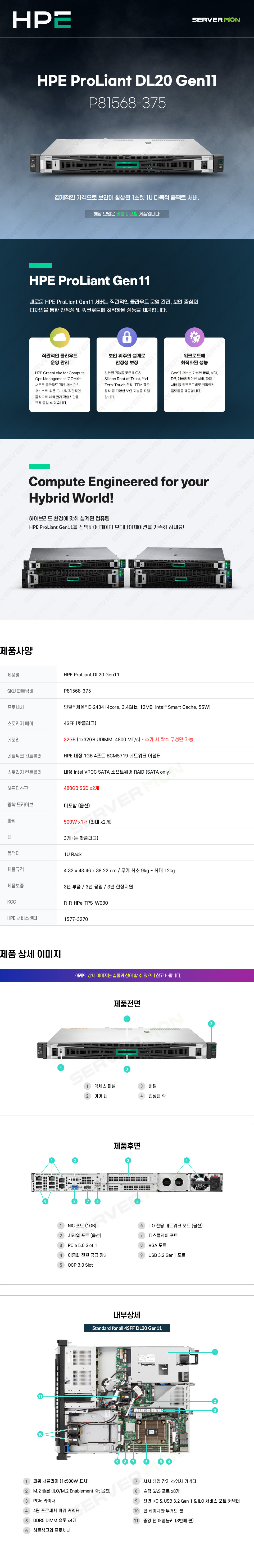- HOME > HPE 서버/스토리지 > 랙형 서버 > Gen11 > HPE DL20 Gen11 (E-2434 4C 3.4GHz 1P / 32GB / 4SFF / VROC / 480GB SSD *2 / 500W) P81568-375