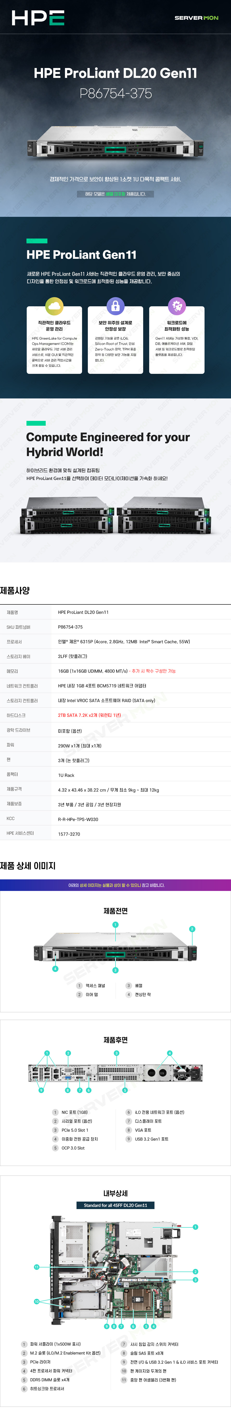 - HOME > HPE 서버/스토리지 > 랙형 서버 > Gen11 > HPE DL20 Gen11 (6315P 4C 2.8GHz 1P / 16GB / 2LFF / VROC / 2TB SATA *2 / 290W) P86754-375