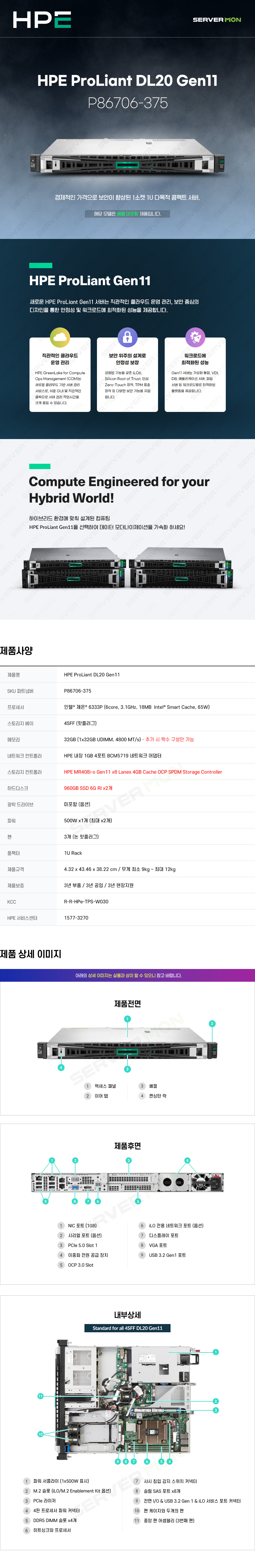 - HOME > HPE 서버/스토리지 > 랙형 서버 > Gen11 > HPE DL20 Gen11 (6333P 6C 3.1GHz 1P / 32GB / 4SFF / MR408i-o / 960GB SSD *2 / 500W) P86706-375