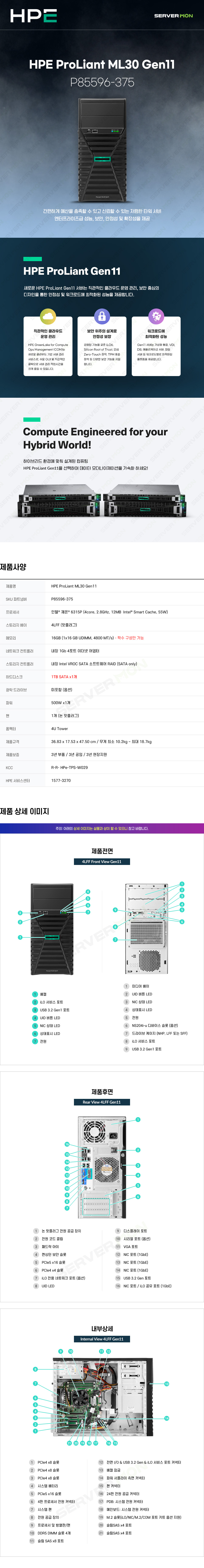 HPE ML30 Gen11 (6315P 4C 2.8GHz 1P / 16GB / 4LFF / VROC / 1TB SATA / 500W) P85596-375