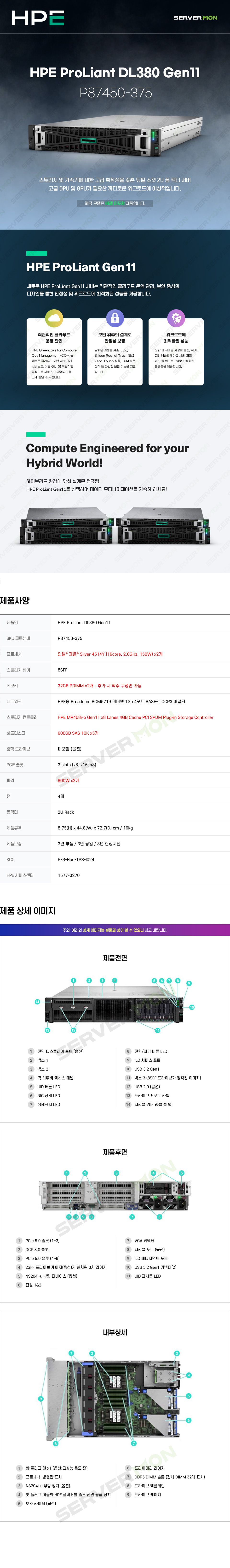 HPE DL380 Gen11 (4514Y 16C 2.0GHz 2P / 32GB *2 / 8SFF / 600GB SAS *5 / MR408i-o / 800W *2) P87450-375